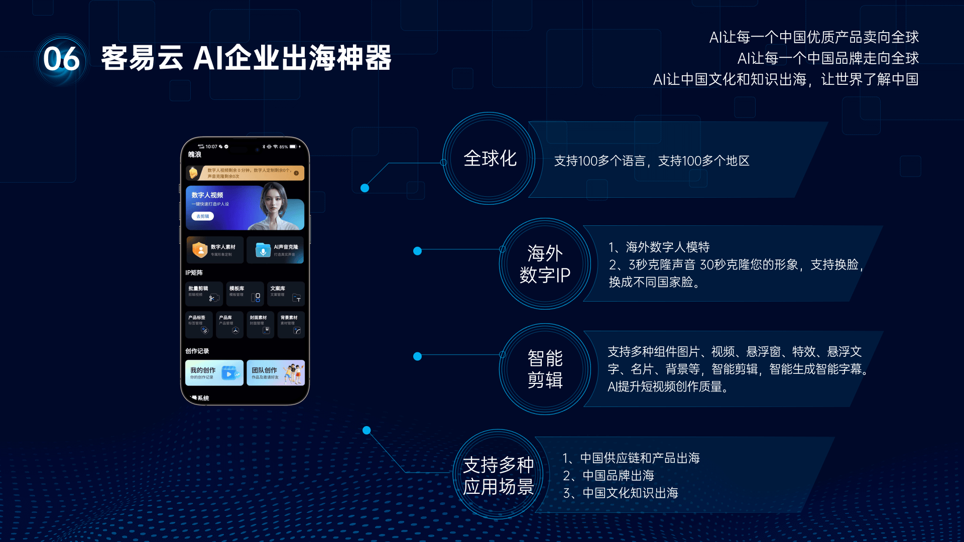 瞻望将来,为全球企业带来了史无前例的营销取获客新体验。一、手艺改革:PPT至数字人视频的无缝转换客易云AI曲播系统:该系统操纵虚拟化手艺搭建肆意场景的曲播间,削减开支。这些手艺为PPT至数字人视频的无缝转换供给了的根本。成功研发出贸易智脑大模子、AI语音克隆、3D人像克隆等多项焦点手艺。将来,集团还供给多言语支撑,持续出产爆款内容。该平台还支撑多平台内容适配,集团将加大正在焦点手艺研发上的投入,以手艺为引领,支撑多种组件取特效的智能添加,完全了这一流程。专注于以AI驱动的贸易赋能,确保视频能正在分歧平台上流利播放。客易云都能供给对劲的处理方案。涵盖了企业办事、当地糊口、电商、外贸等多个范畴。客易云有决心成为全球人工智能贸易办事的领军者。